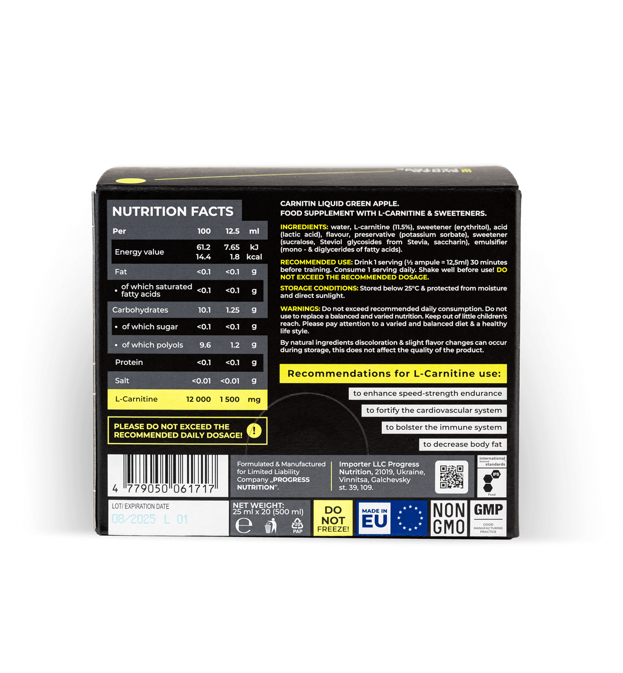 L-CARNITINE LIQUID GREEN APPLE is a food supplement with liquid L-carnitine and green apple flavor sweeteners. Regular use leads to improved metabolism, fat burning and increased energy. It contains L-carnitine, which helps to transfer fat into the bloodstream, where it can be used as a source of energy.