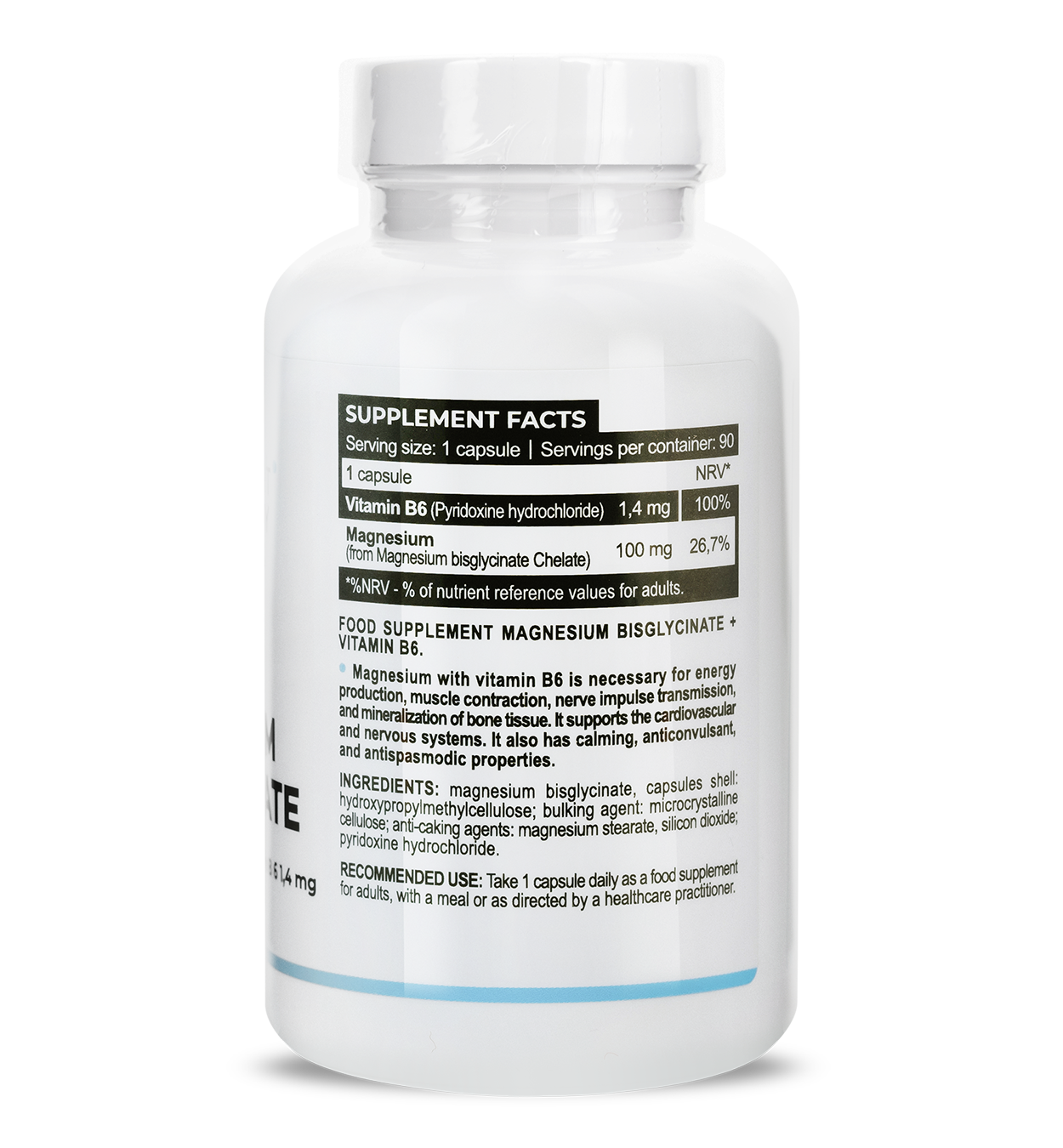 The natural nutrient has high absorption rates. It easily penetrates into body cells, providing maximum effectiveness. The composition contains vitamin B6 (1.4 mg), magnesium bisglycinate (100 mg). Capsules are covered with an organic shell. DOES NOT contain gluten, soy, yeast, sugar, wheat, animal ingredients, preservatives, flavors or sweeteners. Suitable for vegans and athletes.