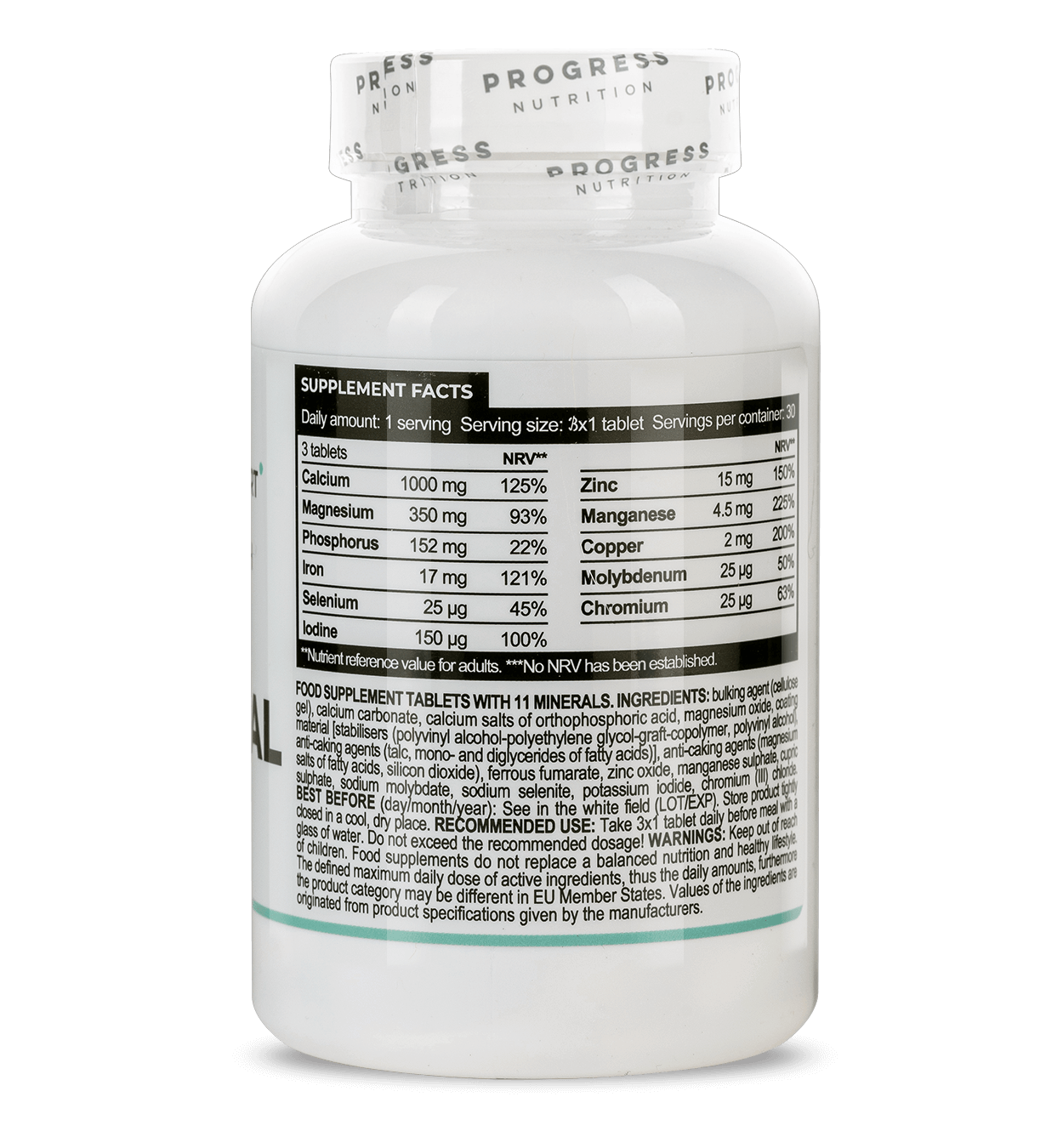 calcium carbonate, calcium salts of orthophosphoric acid, bulking agents (hydroxypropyl methyl cellulose, cellulose gel), magnesium oxide, coating material [stabiliser (hydroxypropyl methyl cellulose), colours (allura red AC1, indigotine, iron oxides and hydroxides)], potassium sulphate, anti-caking agents (magnesium salts of fatty acids, fatty acids), ferrous fumarate, zinc oxide, manganese sulphate, copper (II) oxide, potassium iodide, chromium (III) chloride, sodium molybdate, sodium selenite.