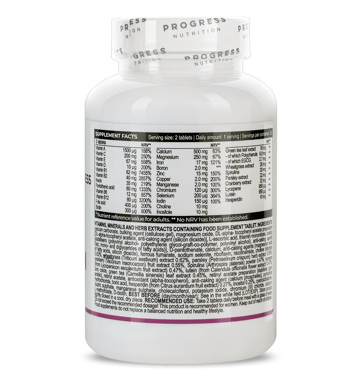 Calcium carbonate, bulking agent (cellulose gel), magnesium oxide, L-ascorbic acid, DL-alpha-tocopheryl acetate, coating material [glazing agent (hydroxypropyl methyl cellulose)], thiamin mononitrate, D-pantothenate, calcium, anti-caking agents (magnesium salts of fatty acids, fatty acids), ferrous fumarate, riboflavin, nicotinamide, Spirulina (Spirulina platensis) frond powder, pyridoxine hydrochloride, alpha-lipoic acid, bitter orange (Citrus aurantium) fruit extract, choline bitartrate, sodium selenite, wheat grass (Triticum aestivum) whole herb extract, parsley (Petroselinum crispum) whole herb extract, cranberry (Vaccinium macrocarpon) fruit extract, tomato (Lycopersicon esculentum) fruit extract, mexican marigold (Tagetes erecta) flower extract, zinc oxide, retinyl acetate, boric acid, inositol, green tea (Camellia sinensis) leaves extract, silicon dioxide, cyanocobalamin, cupric sulphate, manganese sulphate, cholecalciferol, chromium (III) chloride, pteroylmonoglutamic acid, D-biotin, potassium iodide.