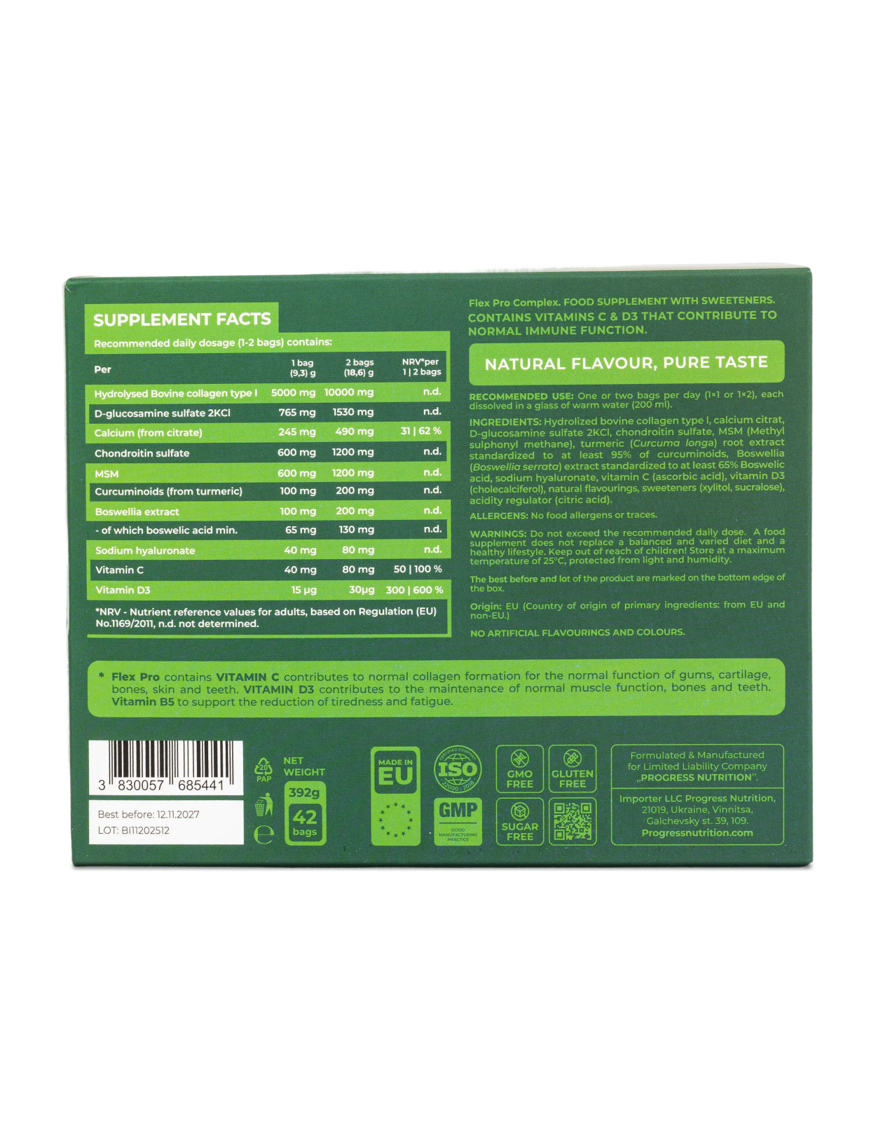 Progress Nutrition представляє Flex Pro Complex — професійну дієтичну добавку для щоденної підтримки суглобів і зв’язок. Формула створена для тих, хто хоче зберігати легкість руху, комфорт і активність у будь-якому віці. Поєднання перевірених нутрієнтів допомагає підтримувати гнучкість, рухливість та здоров’я опорно-рухового апарату — незалежно від рівня фізичної активності та способу життя.
