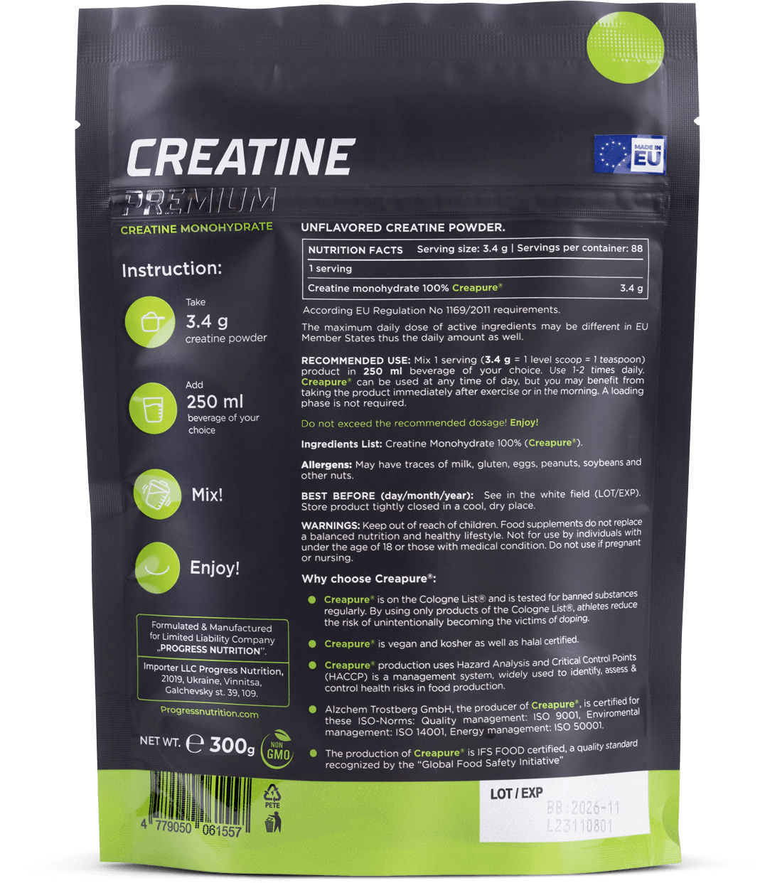 Progress Nutrition Creatine Premium made in Creapure® – унікальний креатин для найкращих тренувань та досягнення спортивного прогресу! Це колаборація брендів Progress Nutrition та Creapure®, знаного в усьому світі виробника креатину преміальної якості. Регулярне вживання продукту може підтримувати запаси АТФ в організмі на належному рівні. Продукт не має смаку, не подразнює слизові кишечнику та шлунку, його випускають в формі порошку, що легко розчиняється в рідині.