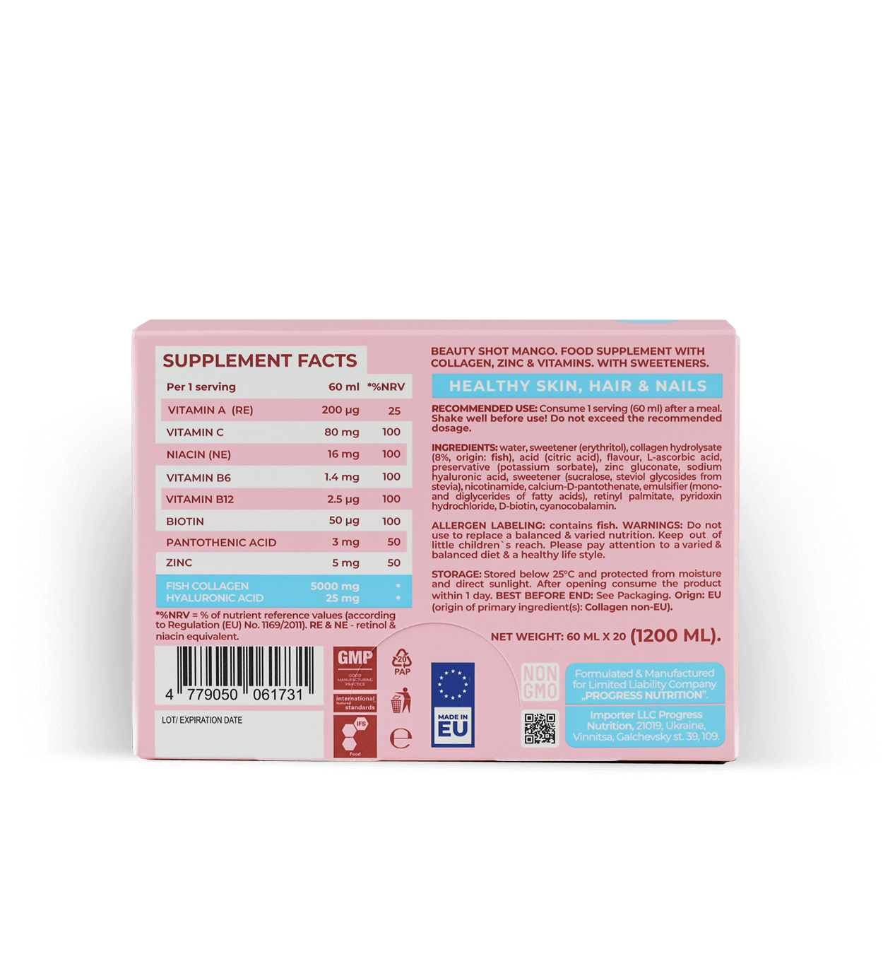 Beauty shot mango — пищевая добавка, для улучшения состояния кожи, ногтей и волос, способствует укреплению суставов и связок. Снижает воспаление в суставных тканях, улучшает подвижность.